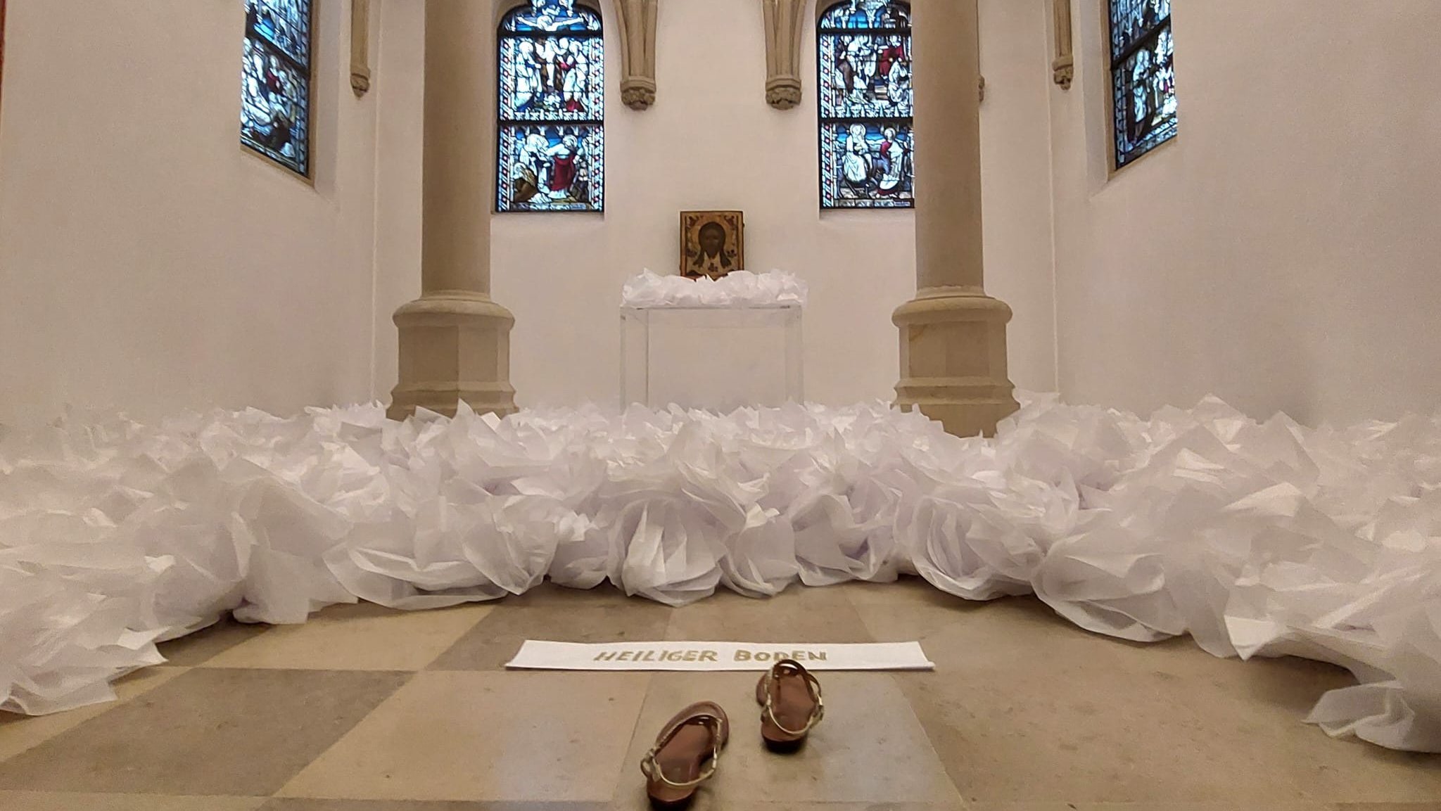 Am Sonntag Palmarum, 06.04.25 endet die Ausstellung der Installation mit einer Messfeier um 10 Uhr und einem anschließenden Predigtgespräch zu den Aussagen der Kunstaktion.